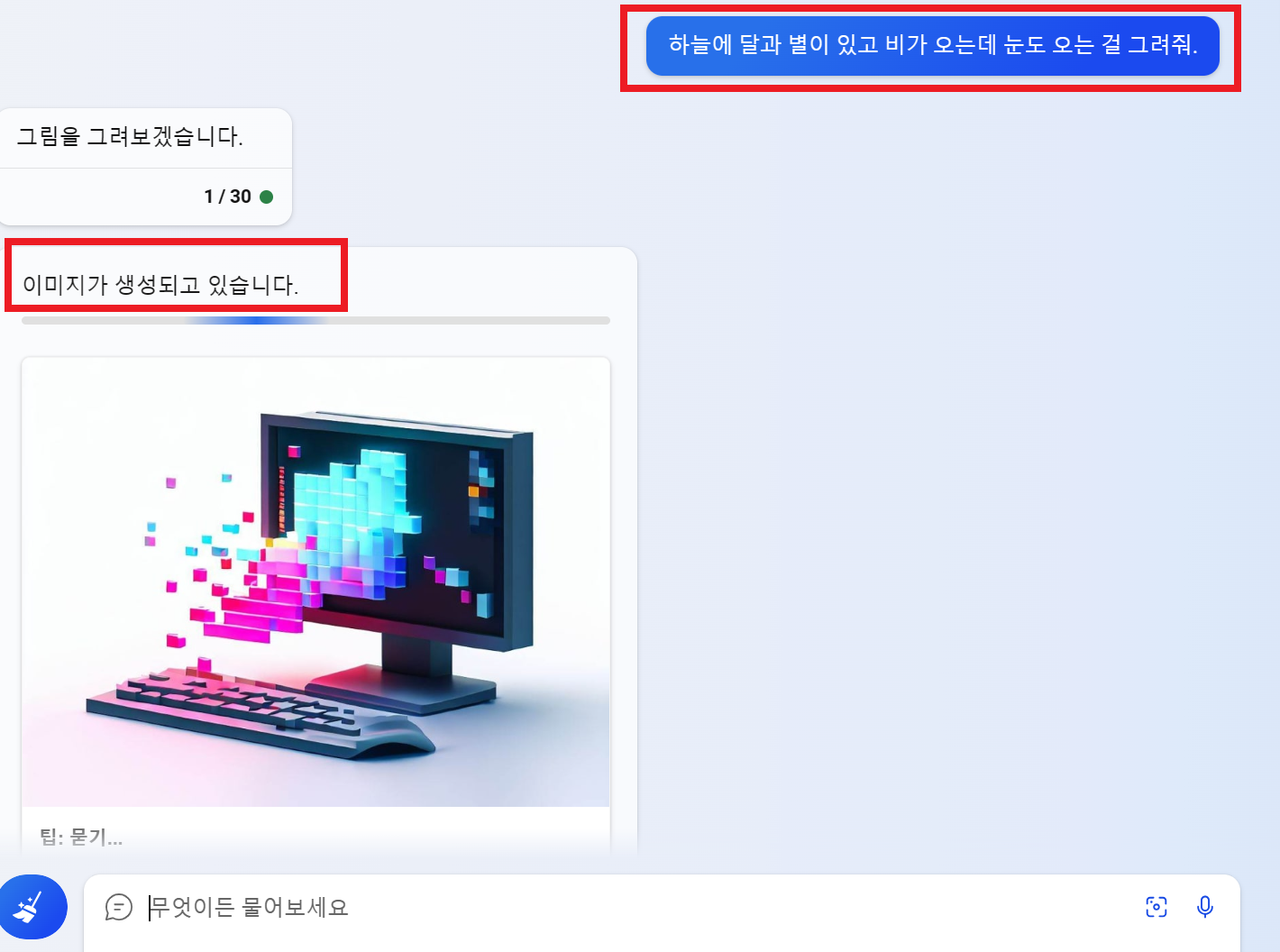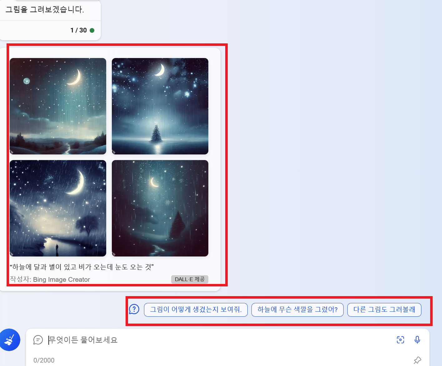 저는 하늘에 달과 별이 같이 있으며 비와 눈이 동시에 오는 그림을 그려달라고 했습니다.