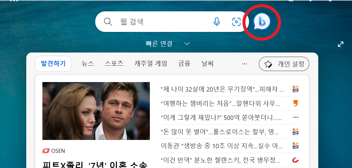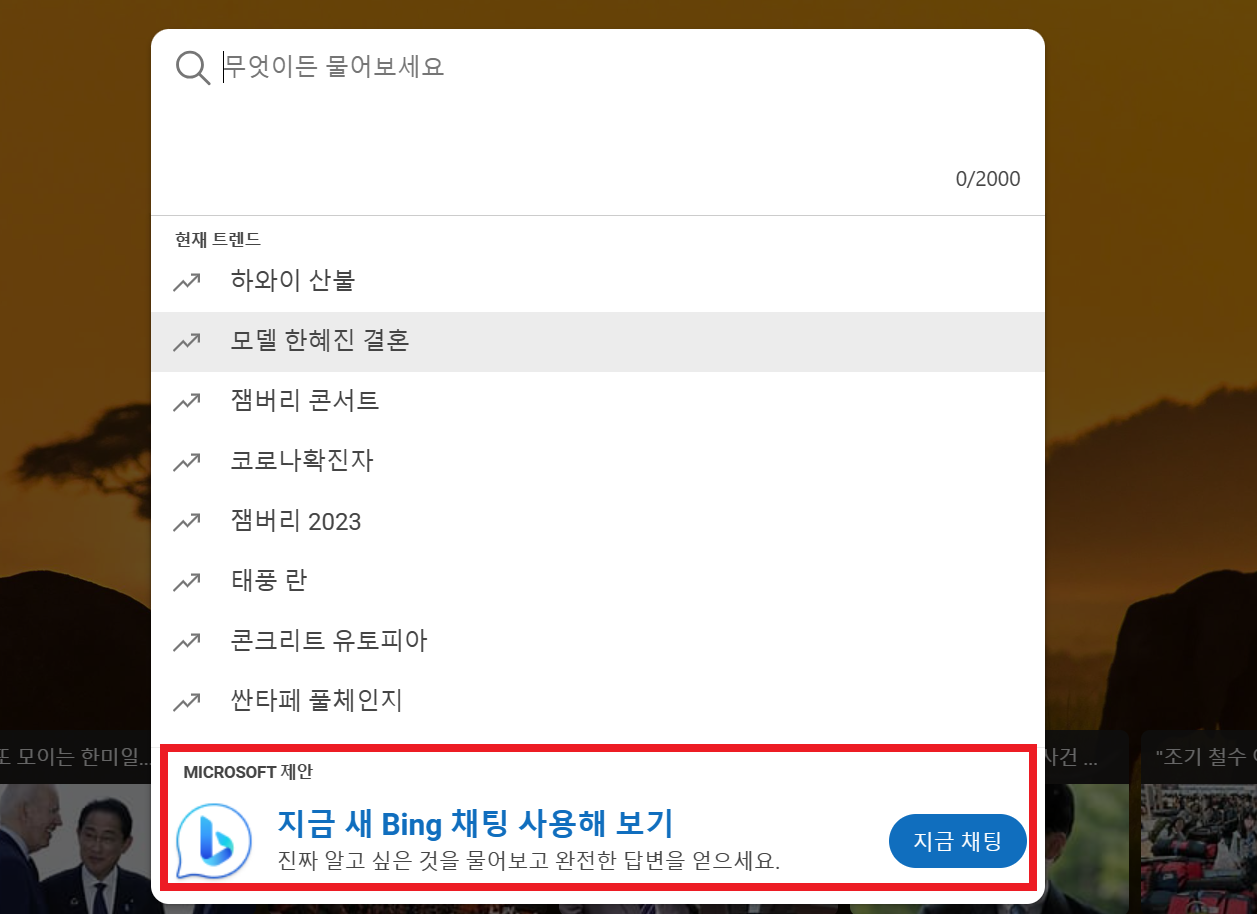기본 검색 화면에서 검색어를 입력하면 밑에 빙챗(Bing chat)을 사용하라고 아이콘이 나오네요.