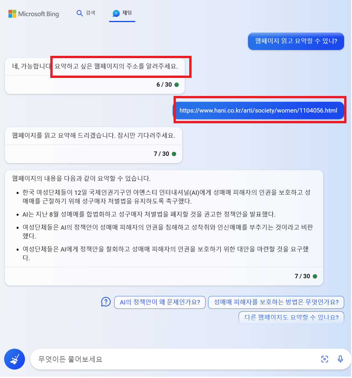 요약하는 기능도 유용합니다. 내가 요약하기를 원하는 페이지 주소를 붙여넣고 요약을 해달라고 하면 간단히 요약을 해줍니다. 시간을 아낄 수 있어서 아주 유용할 것 같아요.