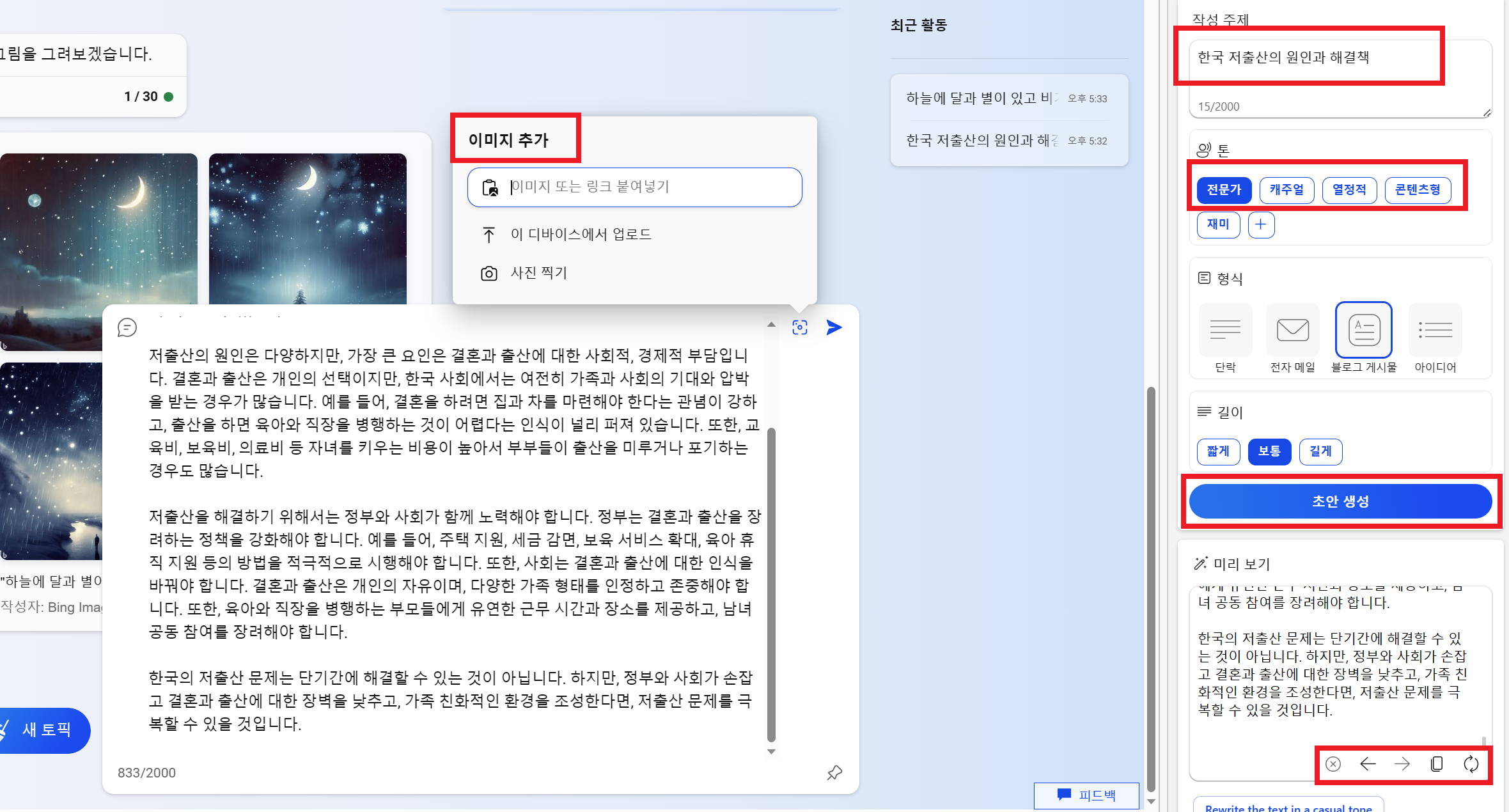 글의 주제를 적고 톤이라고 써 있는 곳에서 원하는 분위기를 선택합니다. 그리고 글의 종류가 블로그인지 메일인지, 어떤 형식의 글을 쓸 것인지 선택을 합니다. 초안을 생성하면 아래와 같이 한 편의 글이 써집니다. 초안을 보고 수정할 사항들을 적어주면 반영하여 재작성이 가능합니다. 글에 이미지를 넣을 수도 있어요.