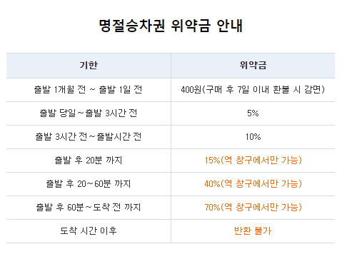 출발 1일 전까지는 400원의 위약금이 발생되며, 출발시간3시간 전까지는 5%, 출발시간 전까지는 10%, 출발 후 20분 까지는 15%, 출발 후 1시간까지는 40%, 도착전까지는 70%의 위약금이 발생됩니다. 도착시간 이후에는 반환이 불가하니 이점 양해해 주시기 바랍니다.